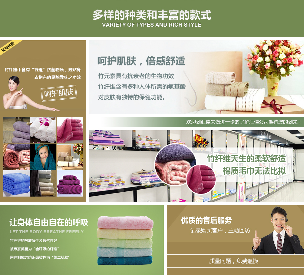 德州匯佳紡織品有限公司專(zhuān)業(yè)生產(chǎn)竹纖維毛巾,是竹纖維毛巾品牌廠(chǎng)家,并且提供竹纖維毛巾禮盒套裝用于福利和禮品。公司座落于山東德州,交通十分便利,公司近臨京滬高速公路,距離德州火車(chē)站、汽車(chē)站10公里京滬高鐵5公里,濟(jì)南國(guó)際機(jī)場(chǎng)120公里。
